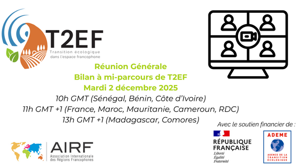 La première année du programme Transition écologique dans l’espace francophone (T2EF), co-financé par l’ADEME touchant à sa fin, l’AIRF propose aux membres de la Commission Environnement, Eau, Energie, Climat de se joindre au 3ème comité de pilotage, présidé par la Région des Grands Ponts (Côte d’Ivoire).